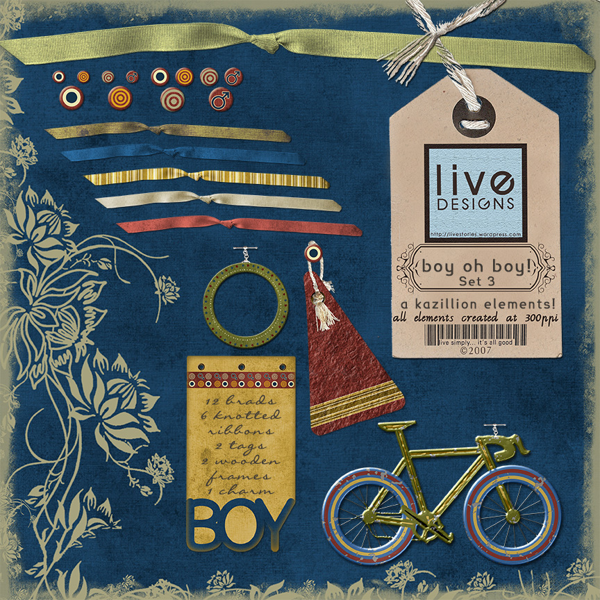 All the elements are in coordinating Boy Oh Boy colors. There are 12 brads, three different sizes of 4 designs each (so you don’t have to resize… though you can, if you want! 😀 ). There are 6 grosgrain ribbons with knots in the middle–5 are solid and one is patterned (I figured the patterned papers were quite busy, so it would be nice to have plain ones that could easily coordinate with them). All the ribbons are 12 inches in length (as the green one is in the preview), but you can easily resize them and make them smaller. As you know by now, I like making items as large as possible so that quality doesn’t suffer when you downsize.