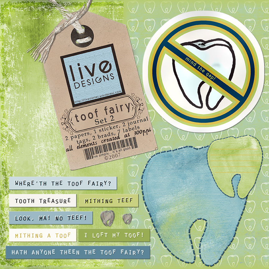 The other day we had the blues, now we have some greens as well! 🙂 There’s a real grungy, scratchy solid paper (looks like it got toothpaste all over it) and a patterned paper filled with teeth. There’s a sticker that says “Mind the Gap” (loved seeing that all over the London tubes); small and big silver tooth brads; 2 paper journal tags with stitches around them (the blue one is shown in its actual-relative size to the layout and is blank; the green one has lines for journaling–I made it smaller but it comes to you in the same size as the blue tag). Then there are the 7 labels. Download Toof Fairy Set 2. Zip password is thankful (Happy Thanksgiving everyone!)
