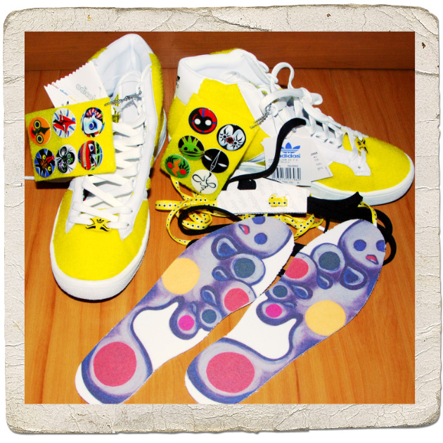 See, they come in this super playful sunshine-y color, and they’re made of velcro material. They come with these super fun colorful insoles, three different pairs of shoelaces that you can change according to your mood, and there are about a dozen circular “patches” that you stick on the velcro in any way you want (hence my association with scrapping… it’s like having a layout on your feet that you can change everyday!). Really: how cool is that?