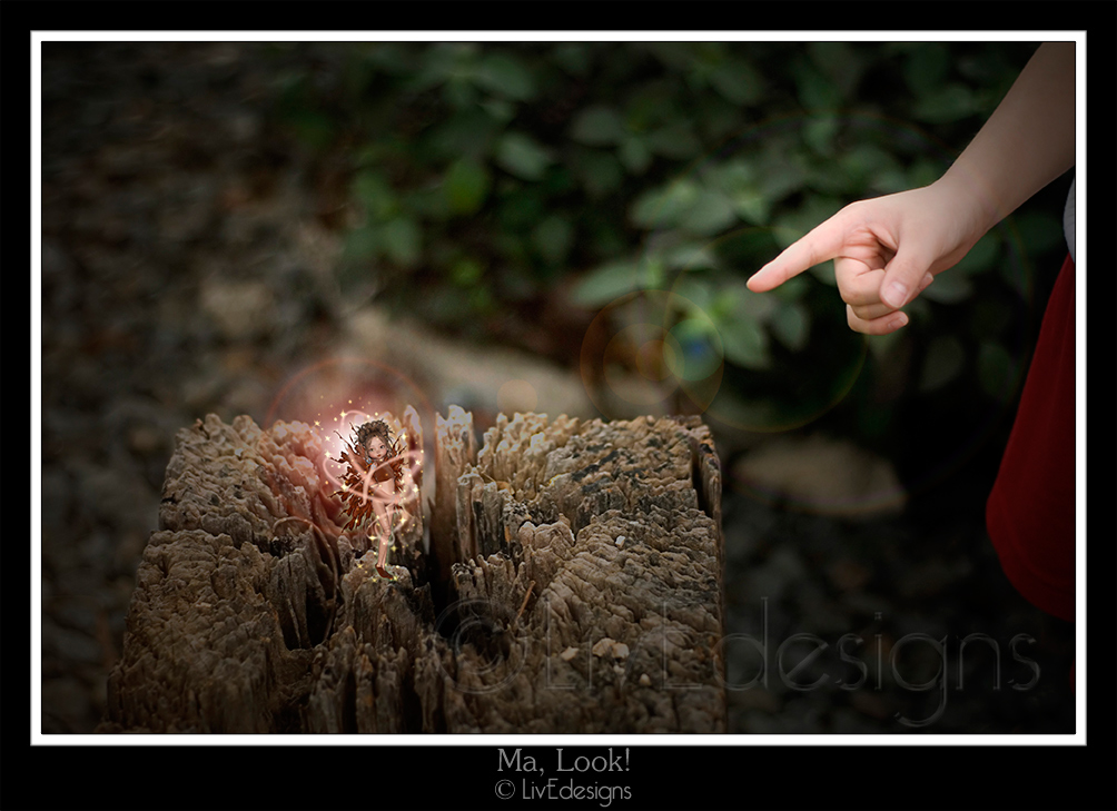 Took this photo of my son’s hand pointing to a wooden thingie on our home grounds while he was on his (most probably) hundredth “Ma, look!”… I don’t remember seeing whatever it was he saw there (an ant?) but when the photo came out, I decided to play a bit with it, and added a little sprite! 😉 Totally played with this! 😀