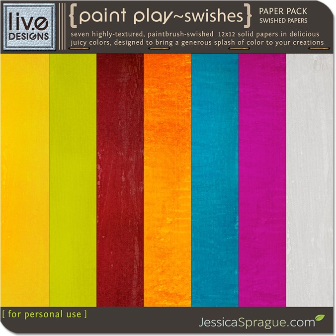 My Paint Play-Swishes paper pack has 7 highly-textured paintbrush-swished 12×12 solid papers in delicious, juicy colors, and all are guaranteed to bring a bright splash of color to your creations. Here’s another look at them: