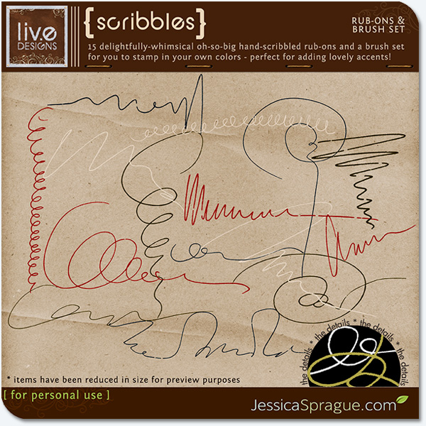 Scribbles features 15 delightfully-whimsical oh-so-big hand-scribbled rub-ons and a brush set for you to stamp in your own colors! These are perfect for adding lovely accents to your layouts and projects!