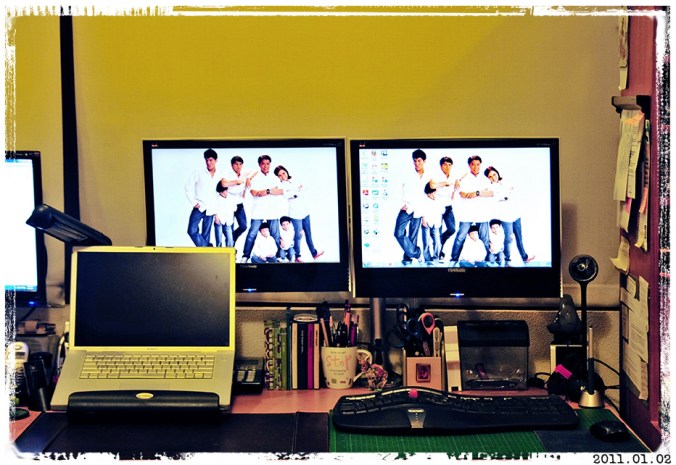 So I spent the first few days of the new year doing my version of spring cleaning (spring into cleaning!)… and here’s the reason why: dual monitors from the hubs. They just make my multi-tasking geeky heart beat faster. 😀 Don’t I just have the best guy in the world?