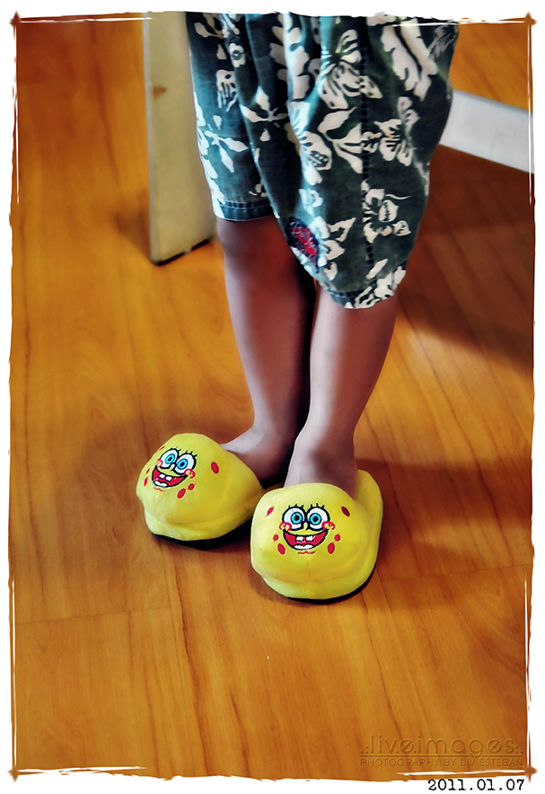 We walk barefoot in our home, but today my littlest one came padding into my room in these soft slippers… a gift from Christmas, but since he tore open all the wrappers in a jiffy, I didn’t get to catch who gave them to him. So thank you, anyway, dear Spongebob gifter! He loves them. 🙂
